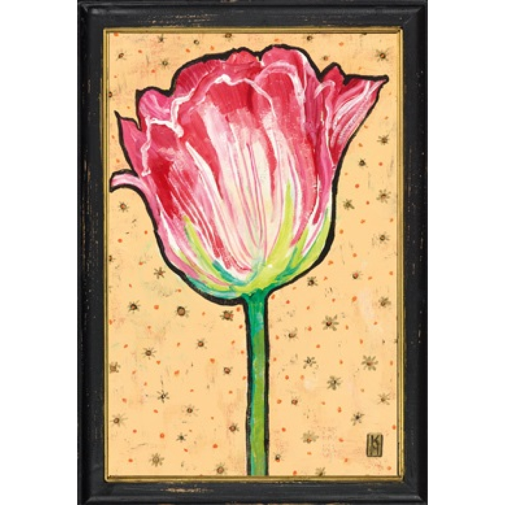 De afbeelding van de roze tulp is uitgevoerd in een expressieve, gelaagde schilderstijl. De levendige roze- en wit-tinten van de bloembladen vormen een prachtig contrast met de warme, zachtgele achtergrond, die subtiel is gedecoreerd met een patroon van kleine gouden steraccenten. Het werk is gevat in een robuuste zwarte houten lijst met een verfijnde gouden binnenrand, die de botanische print een luxe uitstraling geeft. De licht verweerde afwerking van de lijst voegt een authentieke vintage touch toe aan het geheel.