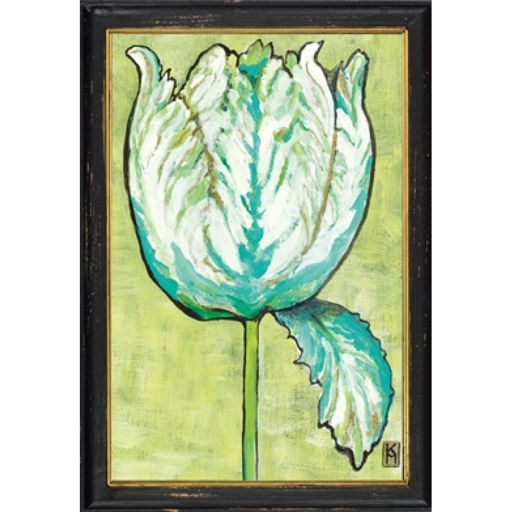 De afbeelding van de witte tulp is uitgevoerd in een expressieve, gelaagde schilderstijl. De zachte wit- en groentinten van de bloem steken prachtig af tegen de heldere, lichtgroene achtergrond, wat zorgt voor een rustgevend en natuurlijk effect. Het werk is gevat in een robuuste zwarte houten lijst met een verfijnde gouden binnenrand, die de botanische print een luxe uitstraling geeft. De licht verweerde afwerking van de lijst voegt een authentieke vintage touch toe aan het geheel.