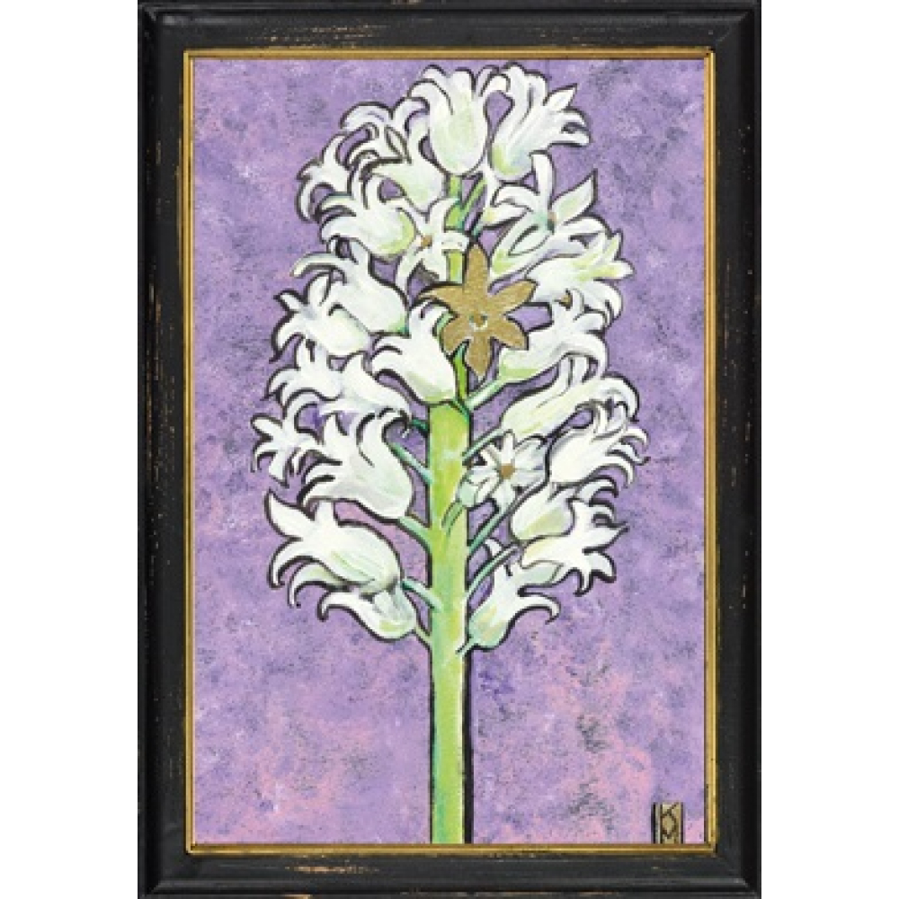 De afbeelding van de witte hyacint is uitgevoerd in een expressieve, gelaagde schilderstijl. De helderwitte bloemen steken prachtig af tegen de zachtpaarse achtergrond, wat zorgt voor een rustgevend en tegelijkertijd luxe effect. Een bijzonder detail is de goudkleurige bloem in het hart van de tros, die het werk een uniek en artistiek karakter geeft. Het werk is gevat in een robuuste zwarte houten lijst met een verfijnde gouden binnenrand, die de botanische print een hoogwaardige uitstraling geeft. De licht verweerde afwerking van de lijst voegt een authentieke vintage touch toe aan het geheel.