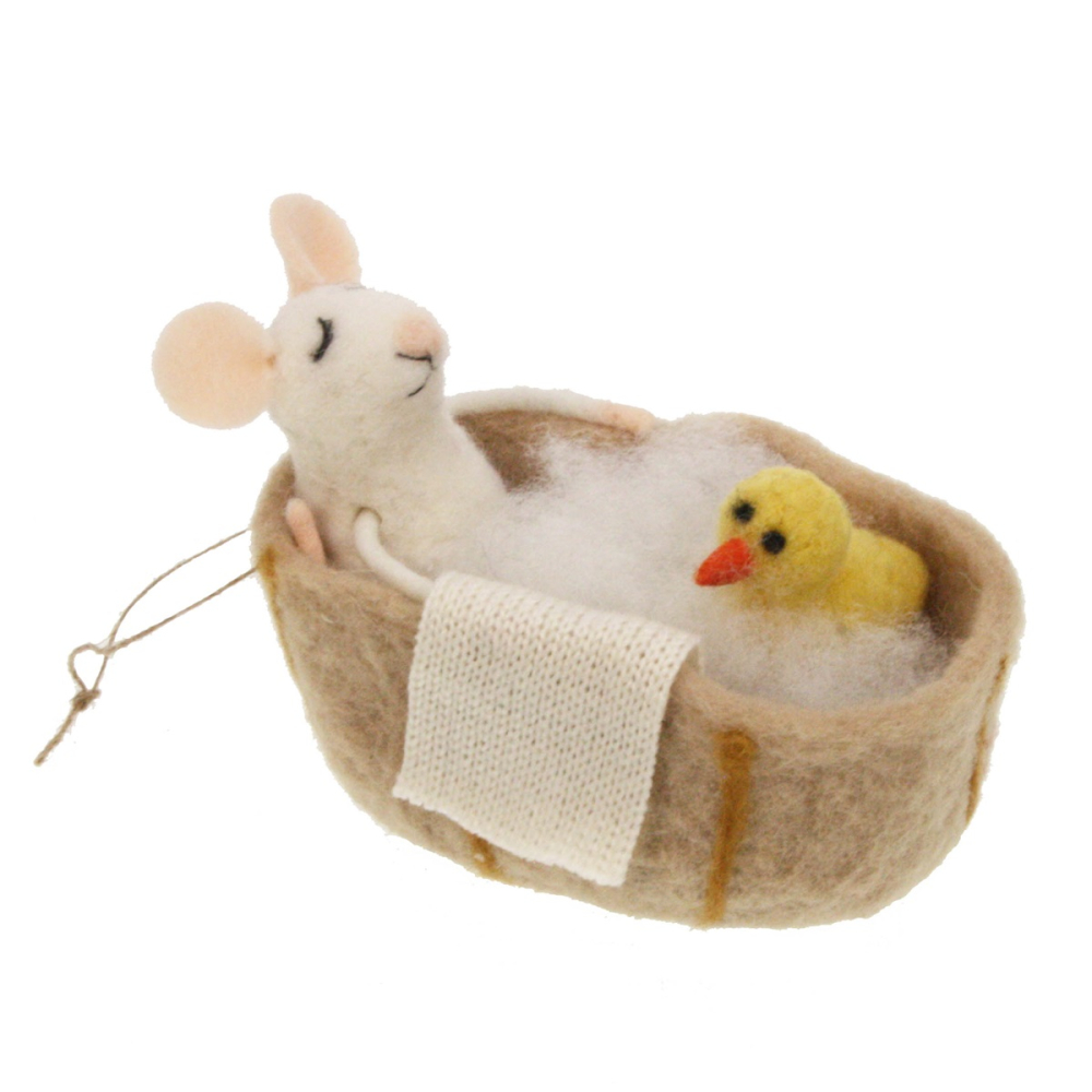 Dit tafereel is met veel liefde en de hand vervaardigd uit hoogwaardig vilt. De details maken het af: van de vredige uitdrukking op het gezichtje van de muis tot het kleine witte washandje dat nonchalant over de rand van het bad hangt. Of je haar nu een plekje geeft in de badkamer, op een wandplank of als vrolijk accent in de kerstboom, deze muis brengt overal een rustige en gezellige sfeer.