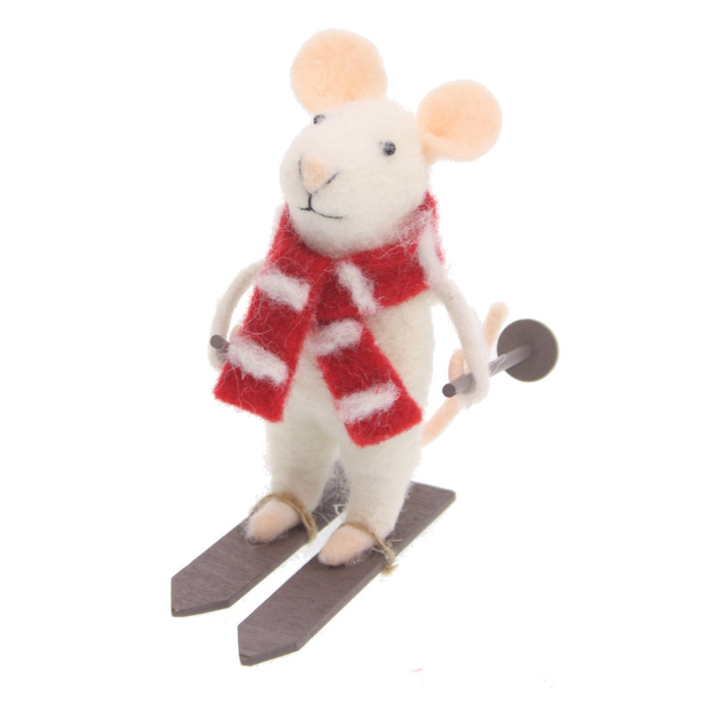 De muis is met veel liefde voor detail vervaardigd uit zacht, wit vilt. Hij is helemaal klaar voor de piste met zijn houten ski's, skistokken en een vrolijke rood-wit gestreepte sjaal die hem lekker warm houdt. De zachte textuur en het vriendelijke gezichtje geven dit item een ambachtelijke en authentieke uitstraling.