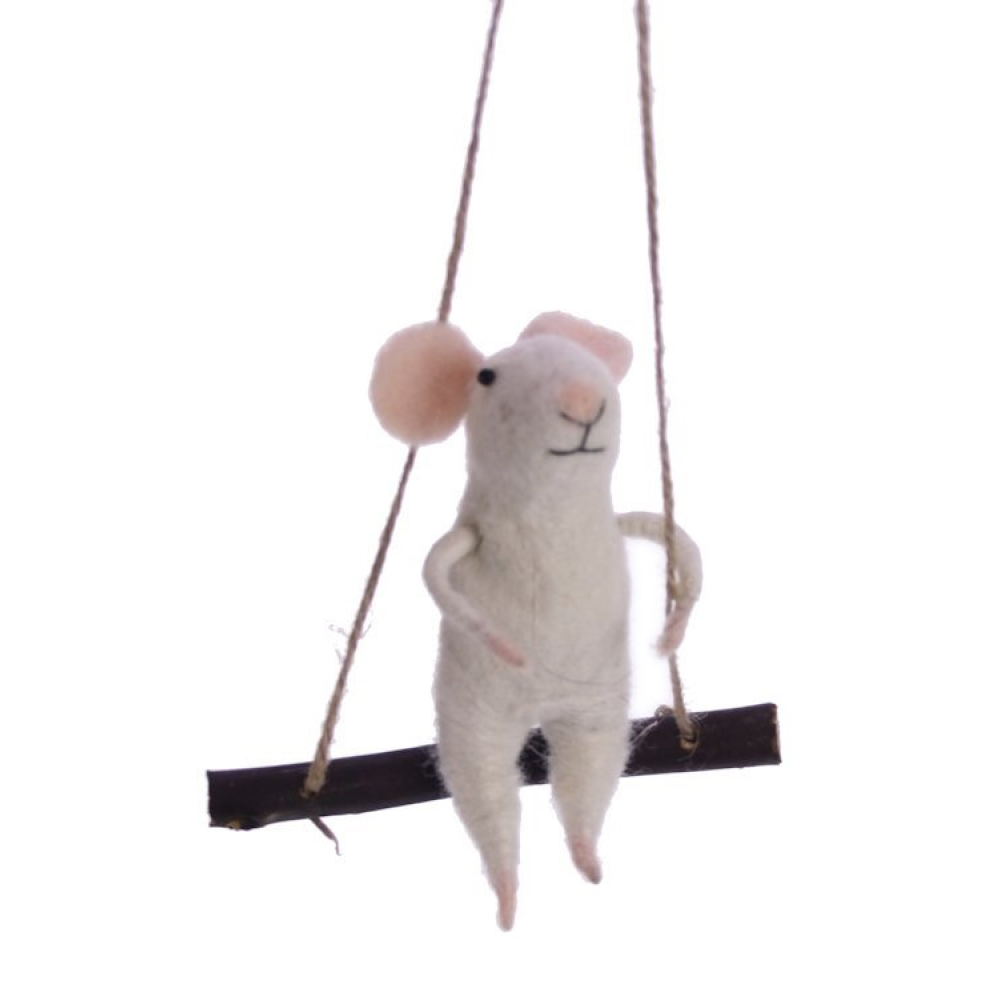 Breng een vleugje speelsheid in je interieur met dit vertederende witte muisje op haar eigen schommel. Met haar pootjes stevig aan de touwtjes en een tevreden uitdrukking op haar gezichtje, lijkt ze zo door je woonkamer of kerstboom te zwaaien.