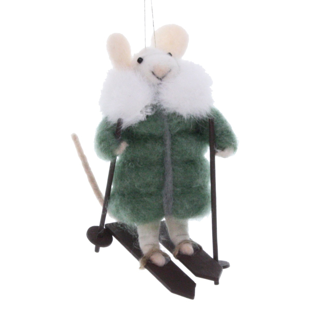 Dit muisje is met grote zorg met de hand vervaardigd uit zacht wit vilt. De details maken haar echt bijzonder: de groene puffer-jas heeft een heerlijk pluizige witte kraag die haar warm houdt tijdens de afdaling. Ze staat stevig op haar donkerbruine houten ski’s en houdt haar zwarte skistokken paraat, klaar om door de (kunst)sneeuw te glijden. Dankzij het handige ophanglusje zweeft ze prachtig in de kerstboom, maar ze kan ook prima zelfstandig staan.