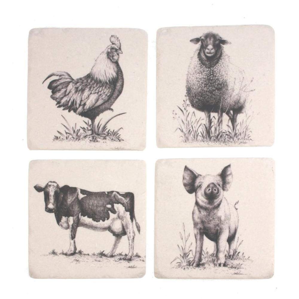 Deze charmante set bestaat uit vier verschillende onderzetters, elk voorzien van een prachtige zwart-wit illustratie van een iconisch boerderijdier: een fiere haan, een wollig schaap, een karaktervolle koe en een vrolijk varken. De realistische tekenstijl op de neutrale, beige achtergrond geeft de set een tijdloze en ambachtelijke uitstraling die perfect past in een landelijk of klassiek interieur.