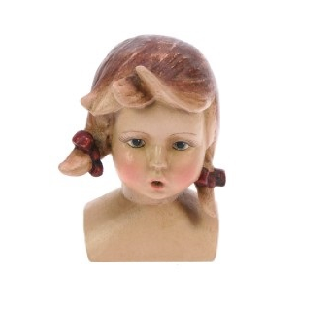 Voeg een artistiek en tikkeltje eigenzinnig accent toe aan je verzameling met dit karaktervolle poppenhoofdje. Met haar dromerige blik, blosjes op de wangen en klassieke vlechtjes met rode strikjes, is dit een opvallend decoratiestuk voor op een boekenplank, dressoir of in een letterbak. Het beeldje heeft een prachtige matte afwerking die de authentieke, verweerde uitstraling van een erfstuk nabootst.