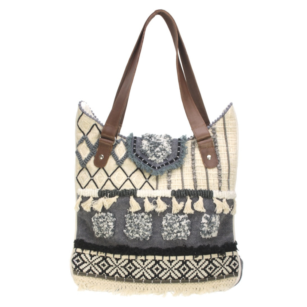 Geniet van een nonchalante, artistieke look met deze prachtig bewerkte tas. Het ontwerp speelt met verschillende weeftechnieken, variërend van grafische ruitpatronen en geometrische randen tot zachte, fluffy accenten. De kleurstelling in 'stonewash' blauw, gecombineerd met gebroken wit en zwart, geeft de tas een stoere maar toch verfijnde uitstraling.