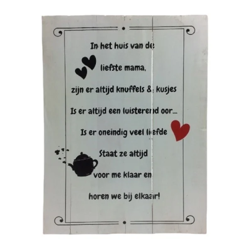 Verras de liefste mama met dit mooie tekstbord met de opdruk "Huis van de liefste Mama". Gemaakt van stevig materiaal en voorzien van een elegante rand, is dit bord een hartverwarmende decoratie voor in huis. Met een afmeting van 30x40 cm is het een echte blikvanger aan de muur of op een plank.