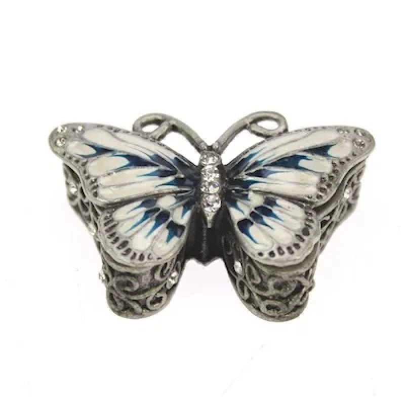 Dit sierlijke vlinderdoosje van emaille is een prachtig klein bewaarblikje voor sieraden, kleine schatten of als decoratief object. De deksel is vormgegeven als een vlinder en zorgvuldig afgewerkt met fijne details en kleuraccenten. Een charmant cadeautje of decoratief accent voor op je dressoir of nachtkastje.