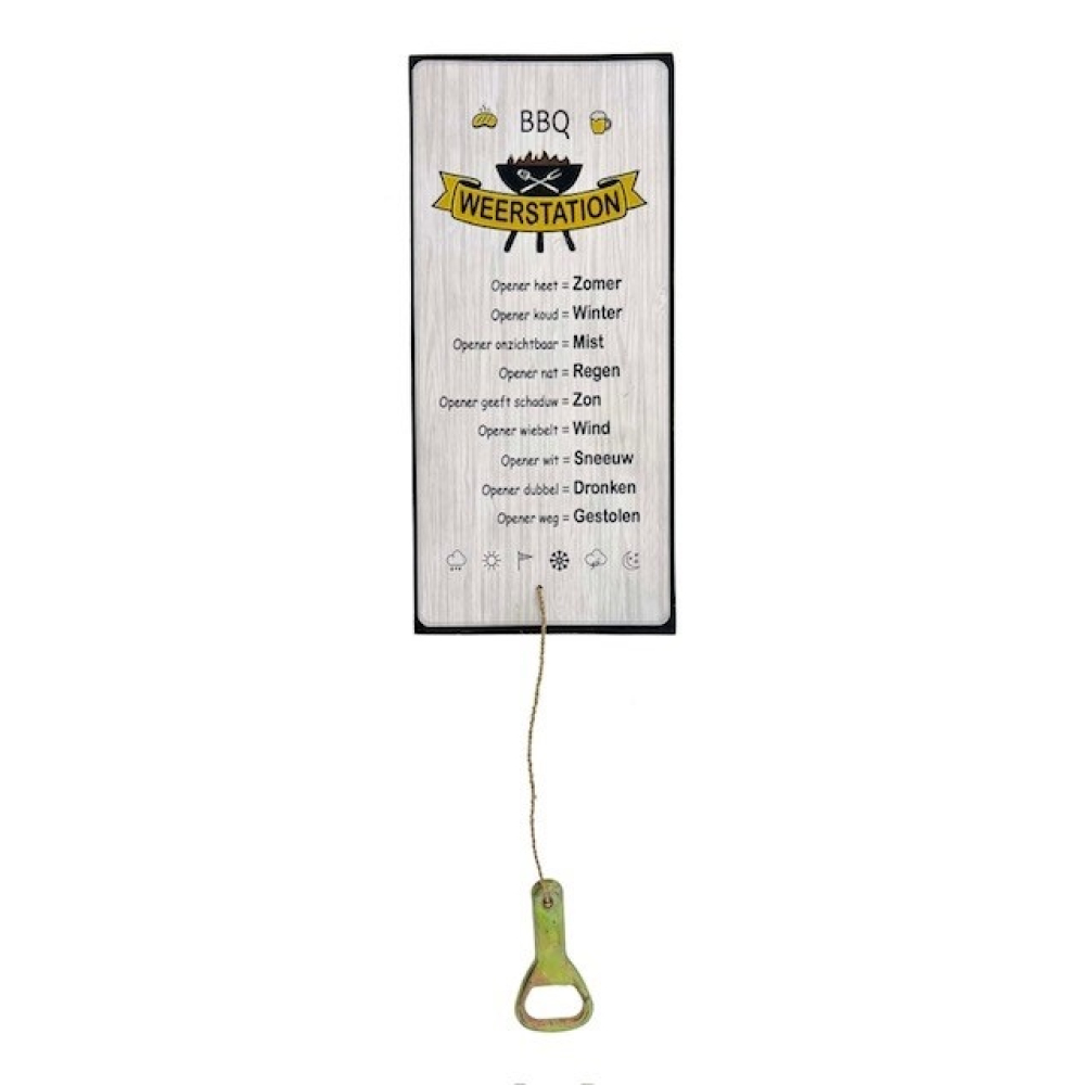 Maak van elke barbecue een feestje met dit originele weerstation. Vergeet ingewikkelde satellietbeelden; dit bord vertelt je precies waar je aan toe bent op basis van de toestand van de aangehechte flesopener. Of het nu "Zomer" is (opener heet) of je "Dronken" bent (opener dubbel), dit bord zorgt gegarandeerd voor een lach tijdens het grillen.