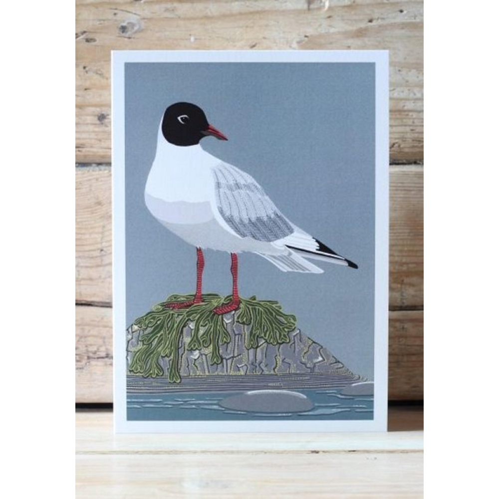 Breng de rust van de kustlijn in huis met deze stijlvolle wenskaart van een meeuw. De illustratie valt op door zijn strakke, grafische vormgeving en het gebruik van een ingetogen kleurenpalet van grijs-, wit- en zwarttinten, geaccentueerd door de opvallende rode poten. De gedetailleerde weergave van de vogel op een met zeewier begroeide rots geeft de kaart een verstilde en artistieke uitstraling. Een prachtige keuze voor een maritieme groet, een verjaardag of als kleine kunstdruk in een modern interieur.